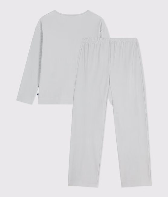 Damespyjama van onregelmatige fluwelen bouclé, een warme en verfijnde stof met ribbeleffect. Damespyjama van onregelmatige fluwelen bouclé, een warme en verfijnde stof met ribbeleffect. Bovenstuk in sweatshirtmodel, aansluitend aan de taille met een ribboord. Rechte pijpen en elastische tailleband voor meer comfort. Het model is 171 cm groot en draagt maat S.