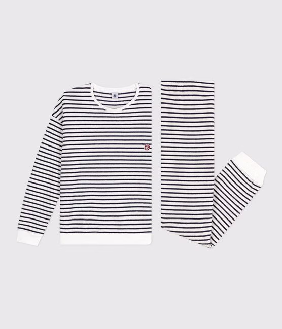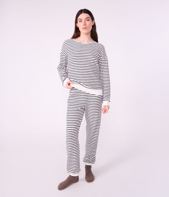 Damespyjama van zachte en warme badstof. Dit model is gemaakt van badstof uit katoen/model voor een heerlijk zacht gevoel en een soepelvallende pasvorm. De stof is geruwd aan de binnenkant voor extra warmte en zachtheid. Bovenstuk in sweatshirtmodel, aansluitend aan de taille met een ribboord. Ribboord onderaan de mouwen en de pijpen. Elastische tailleband. Geborduurd Petit Bateau-logo op de borst. Voor het hele gezin: de print komt ook terug op het model voor baby’s en kinderen. Het model is 172 cm groot en draagt maat S.